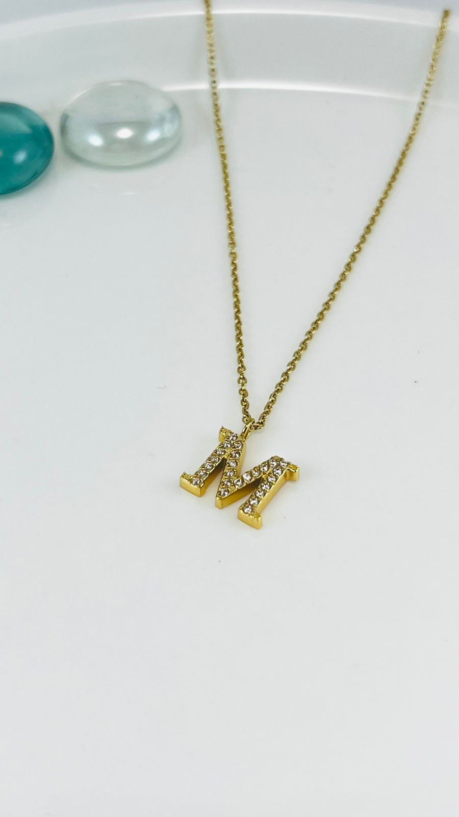 Collar dorado dije letra M pedrería incrustada