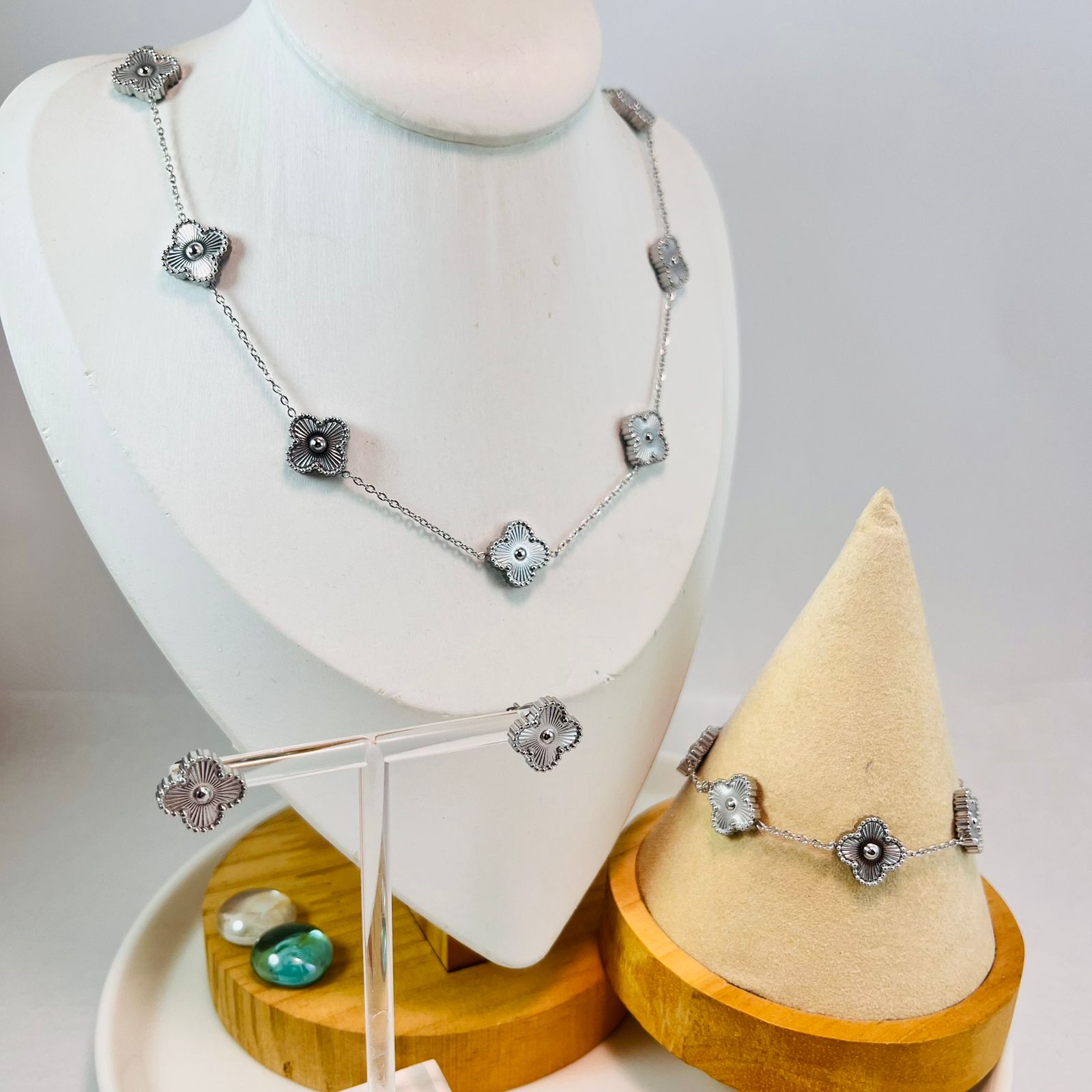 Set plateado gargantilla, pulsera y aretes Alhambras doble lado